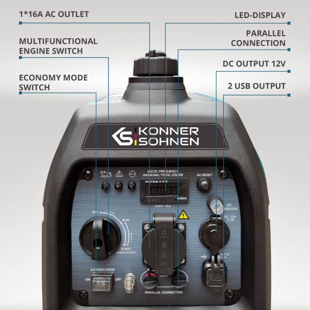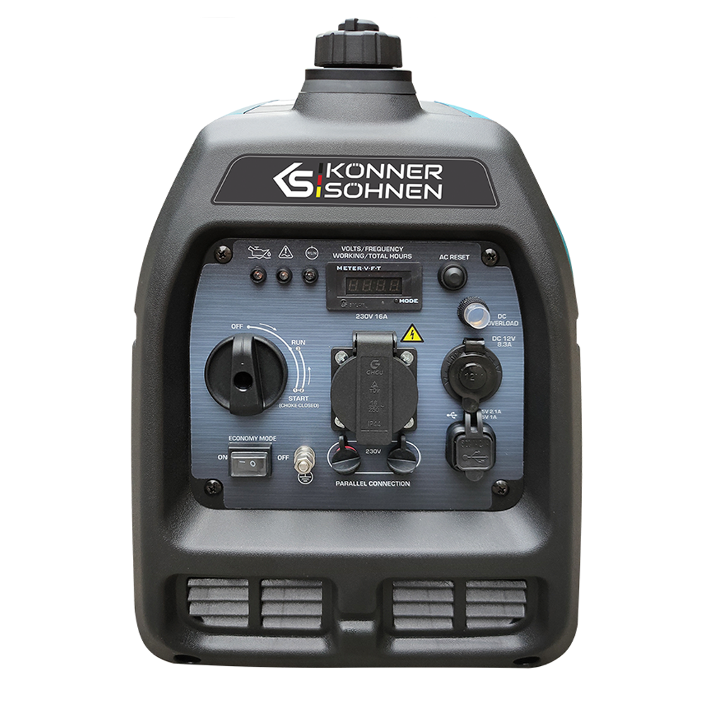 A Könner & Söhnen inverteres generátorok megbízható, szénkefe nélküli, 100%-ban réz tekercselésű generátorral vannak felszerelve. A kiváló minőségű, állandó mágneses generátor műanyag házban kap helyet, és a legnagyobb terheléseket is károsodás nélkül képes elviselni, garantálva a generátor hosszú távú, megbízható működését.