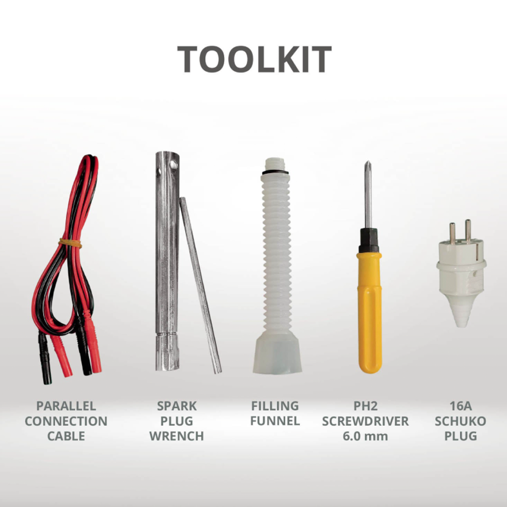 Opcionálisan rendelhető 15 méteres, kábeldobos hosszabbító (#KS-CR-15M), 3 méteres 32A -> 16A hosszabbító (#KS-EX3M-4S), valamint 5 literes (#KS-CAN-5) és 10 literes (#KS-CAN-10) üzemanyag kanna.
