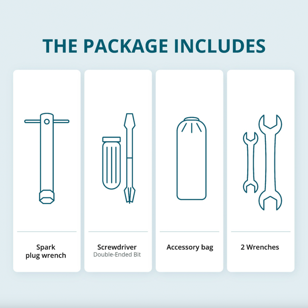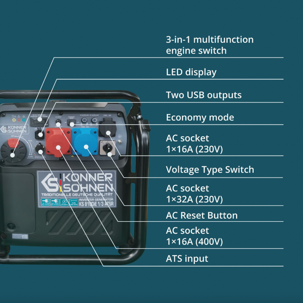 Az összes funkció praktikus elrendezése: a generátor állapotát mutató jelzők, amelyek megjelenítik az üzemmódot, a túlterhelés vagy rövidzárlat esetén működésbe lépő megszakítót, valamint az alacsony olajszintet. Ezen felül található egy reset gomb a vezérlőrendszer újraindításához és az áramellátás visszaállításához, két USB kimenet (5 V / 1 A, 5 V / 2,1 A), egy 12 V-os autós csatlakozó, amely lehetővé teszi autós készülékek, szerszámok és akkumulátortöltők csatlakoztatását, 230 V-os aljzatok és földelési kapocs.