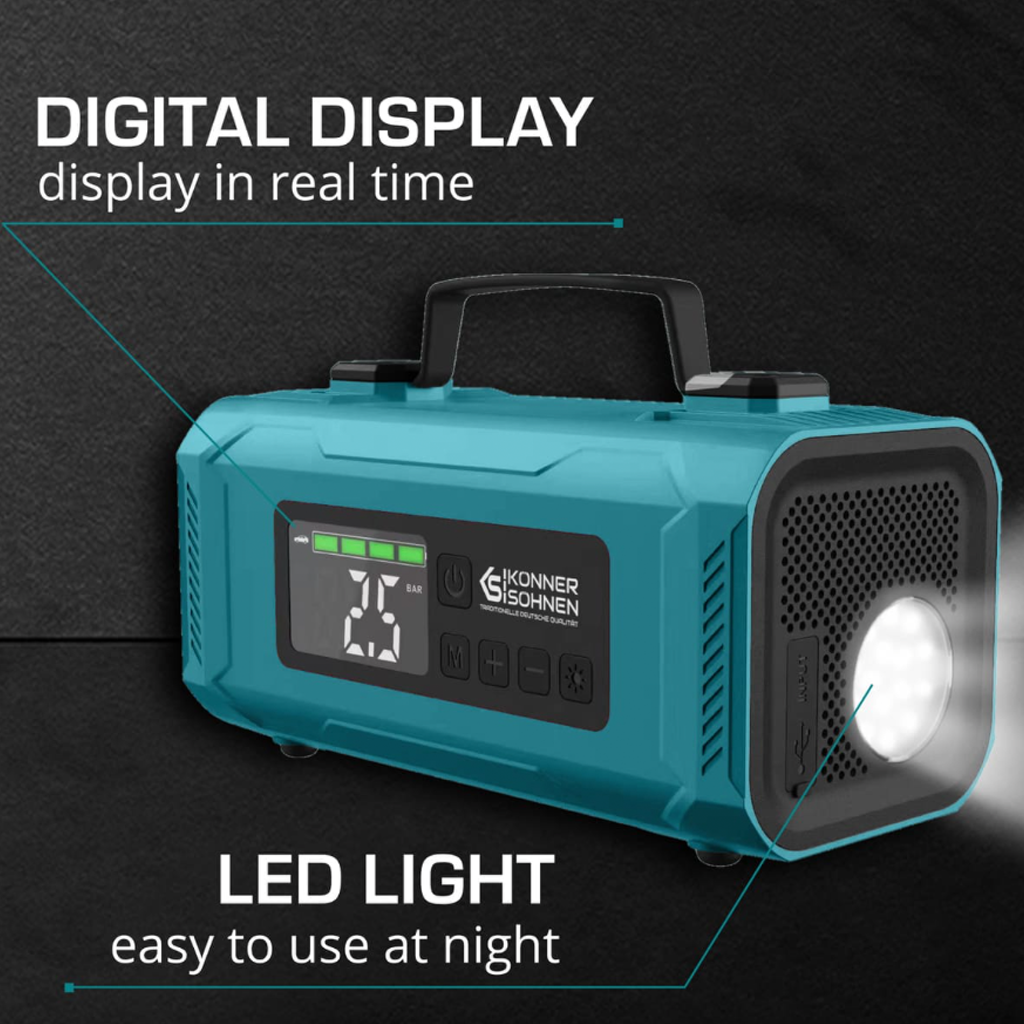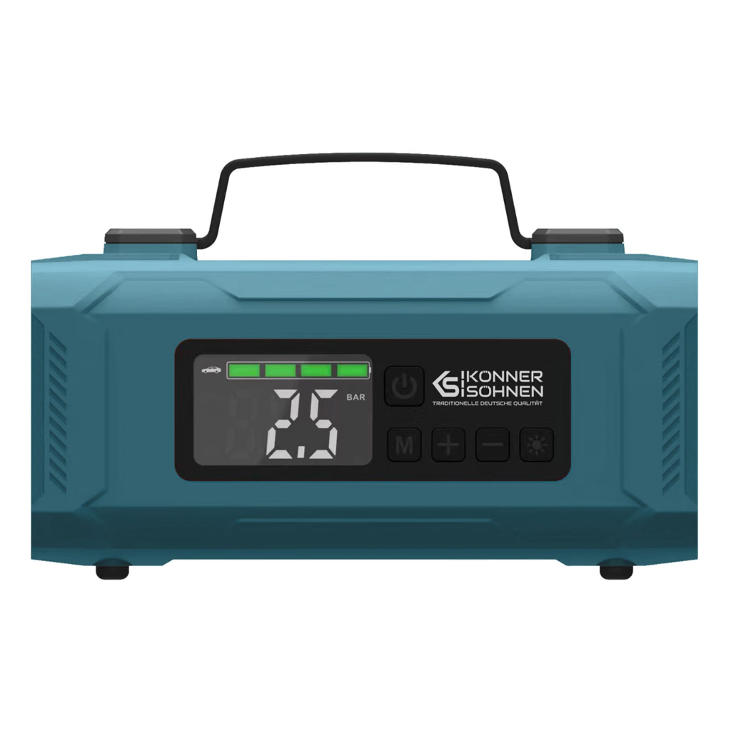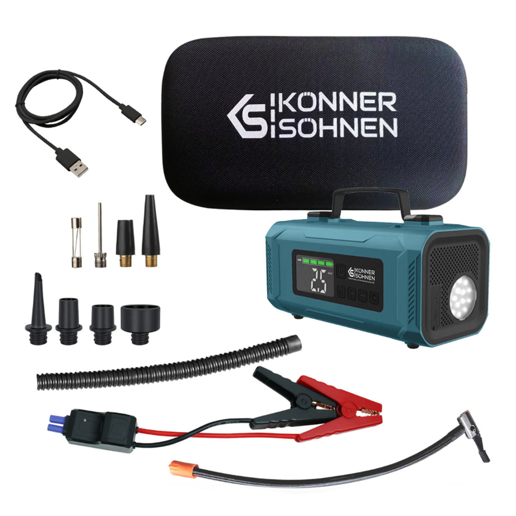 A Könner & Söhnen KS-JSP-2000 egy sokoldalú, hordozható 4 az 1-ben eszköz, amely indítássegítőként, kompresszorként, nagy kapacitású power bankként és LED lámpaként is használható. Kompakt kialakításának köszönhetően ideális választás vészhelyzeti energiaellátáshoz, járművekhez és különféle felfújható eszközökhöz egyaránt.