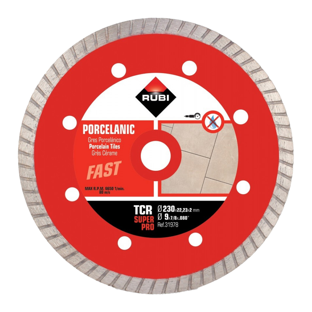 Rubi TCR 230 speciális, turbó szegmensű gyémánttárcsa porcelánlapok száraz vágására.