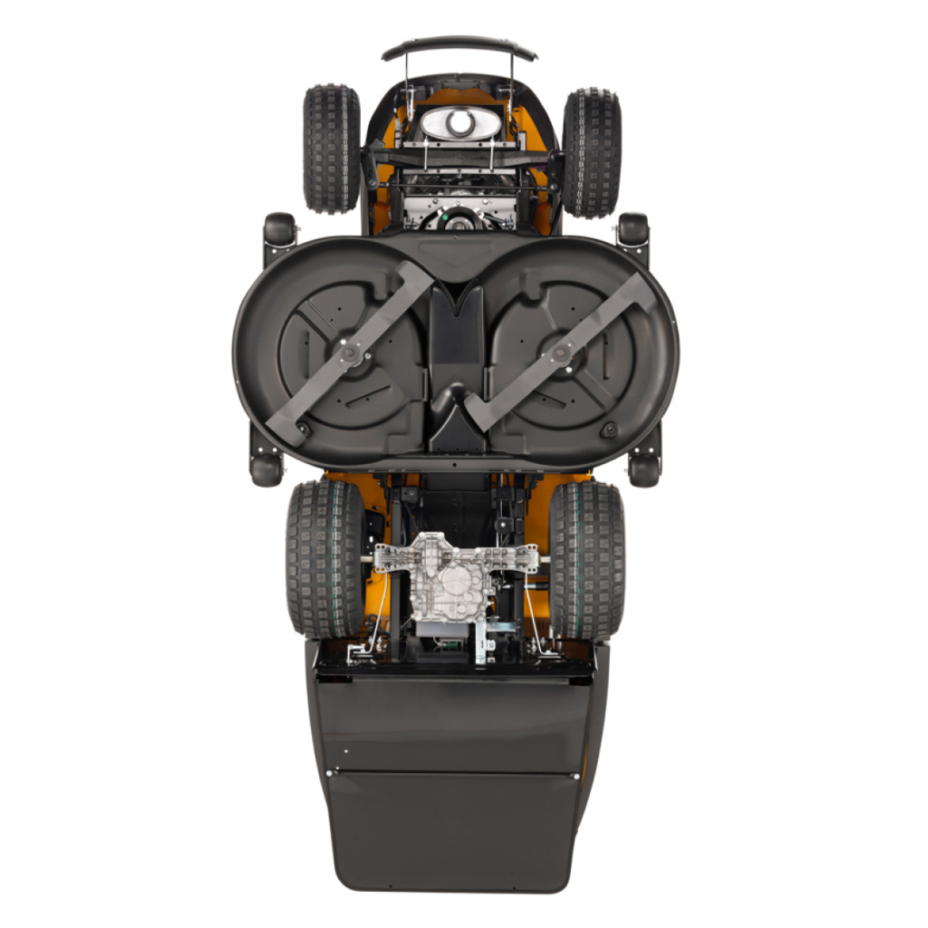 A strapabíró 122 cm-es dupla késes vágóasztal elektromágneses késindítással, 30 és 90 mm között 7 vágási magasság-beállítással tökéletes nyírást biztosít. Ön dönti el, hogy füvet a 320 l-es fűgyűjtőbe gyűjti, vagy mulcsozó dugó behelyezésével mulcsozza.