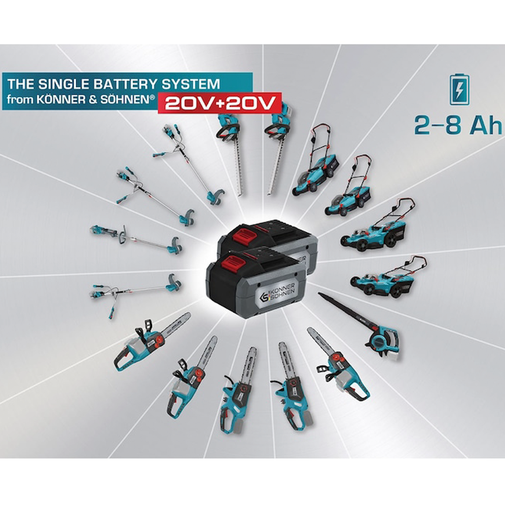A Könner & Söhnen® univerzális akkumulátorainak köszönhetően elegendő egyetlen, megfelelő kapacitású akkumulátort és egy töltőt beszerezni, amely a márka összes kompatibilis akkumulátoros kerti szerszámával használható. Ez kényelmes és gazdaságos megoldást biztosít a teljes termékkínálaton belül.