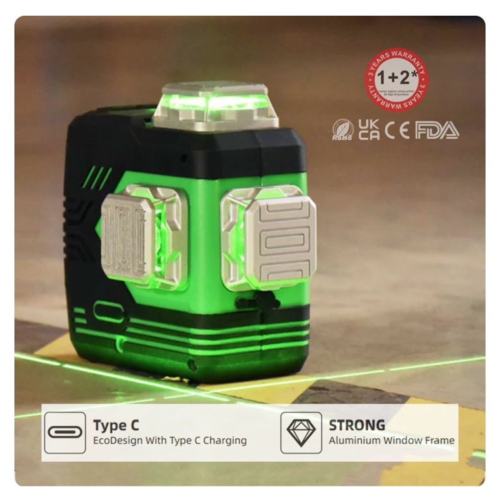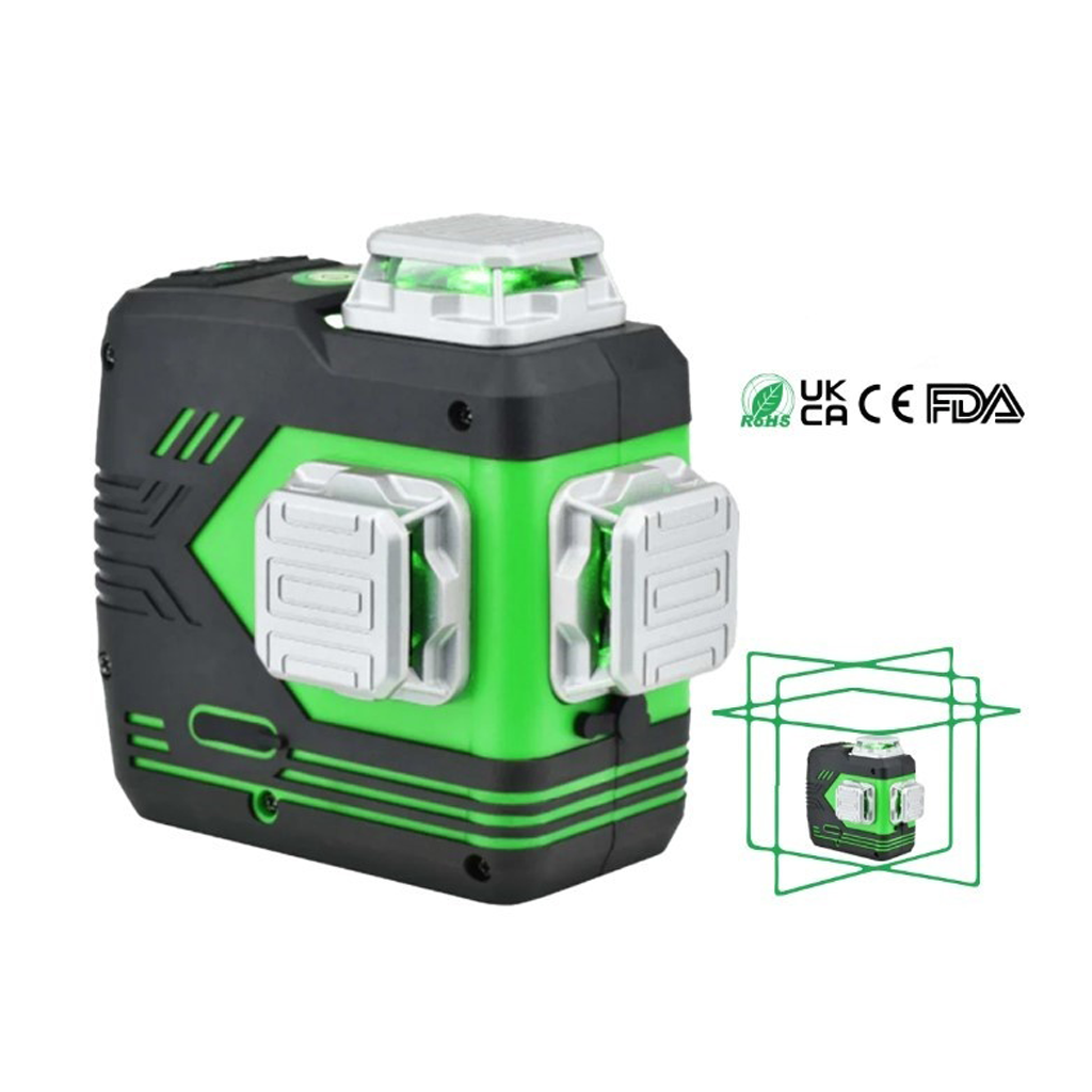 Zöld lézeres szintező három 360°-os síkkal és önszintező funkcióval.