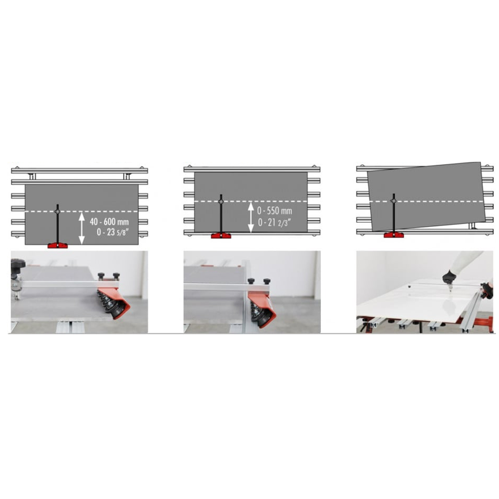 A bevágás elvégzéséhez az eszköz használható úgy, hogy a kocsit a lap szélére helyezzük (párhuzamos vágásokhoz), vagy a munkapad széléhez (ferde vágásokhoz). A bevágás elvégzéséhez tartsa a T-Cut-ot a szél mentén, és húzza végig a lap teljes hosszán, miközben egyidejűleg nyomást gyakorol a tengelyre a görgővel.